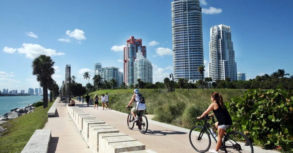 Brickell e Downtown Miami: O centro financeiro de Miami se tornou um polo vibrante, com hotéis de luxo, restaurantes estrelados e condomínios modernos. Apesar do ar urbano, há uma infraestrutura forte para atividade física. O Bayfront Park, ao lado da baía de Biscayne, dispõe de calçadões largos para corredores, academia ao ar livre e gramados para ioga matinal. Ao sul, Brickell Key tem um percurso circular ao redor da ilha, perfeito para corridas urbanas com vista para o skyline. Bike-sharing do metrô (MetroBike) e ciclovias dedicadas na Ocean Drive e na Venetian Causeway conectam Downtown a Miami Beach.